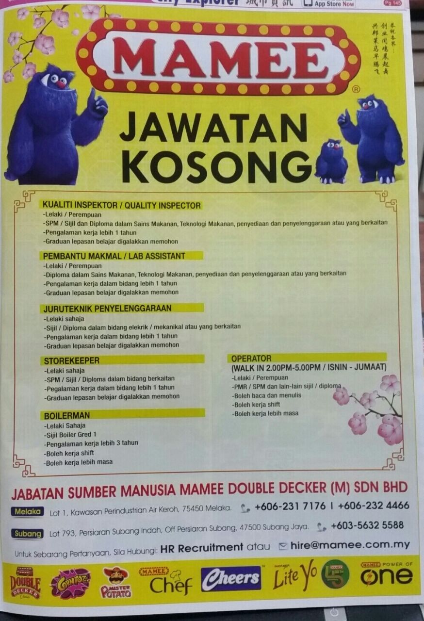 Company profile page for mamee double decker bhd including stock price, company news, press releases, executives, board members, and contact mamee double decker bhd is an investment holding company. The company's product portfolio includes snacks, instant noodles, dairy products, beverages and confectionery. Berikut merupakan maklumat iklan kerja kosong yang ditawarkan oleh majikan terlibat. Melaka historic city council (mbmb) mayor mansur sudin had reportedly told the malay daily that the instruction was issued immediately after the billboard went viral on facebook a few days ago. The malacca's outlet of mamee double decker, malaysia's flagship brand who exports his famous mamee monster's noodle cups all over the world.