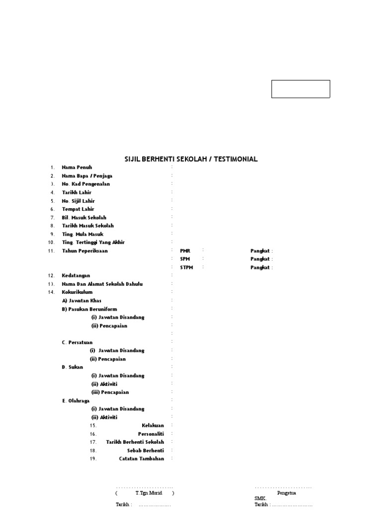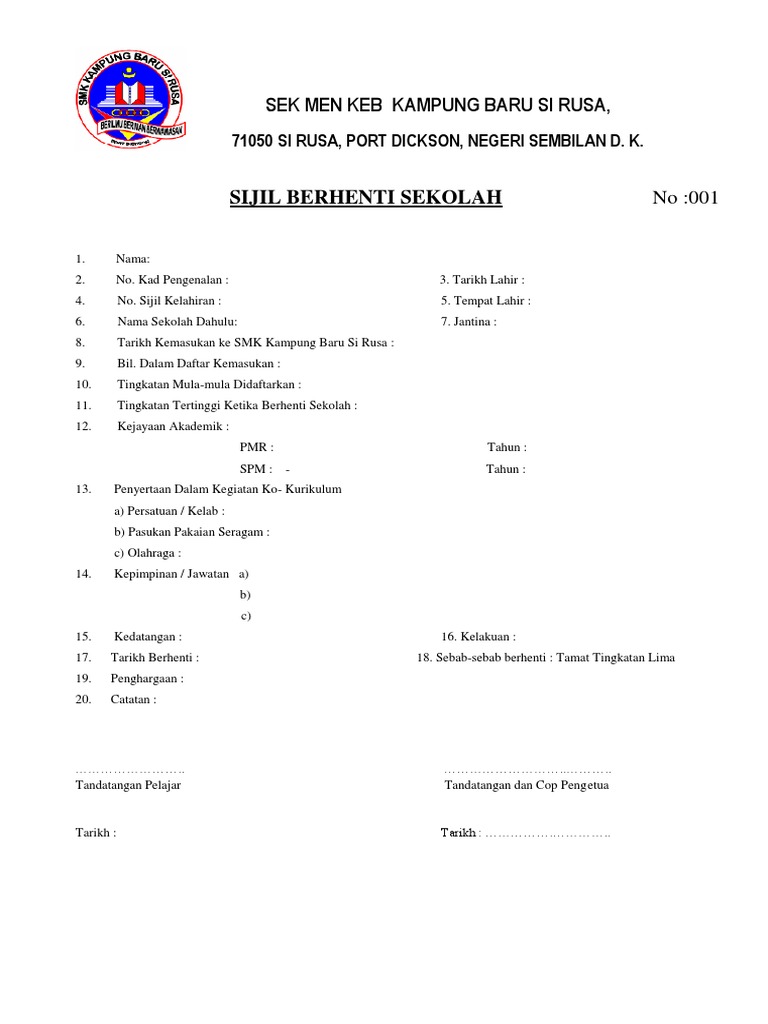 Beberapa Pelaporan Slip Yang Perlu Ada Selepas Tamat Sekolah Rendah Sumber Pendidikan from sumberpendidikan.com Salinan sijil berhenti sekolah dan surat akuan (testimonial)sekolah menengah. By joe mir 15825 views. Kita bukan nak tolak dunia, tapi dunia ini untuk jambatan ke akhirat. Certificates » sijil berhenti sekolah. Sijil berhenti tahun6 t skj 2011 version baru. Sekolah menengah teknik melaka, melaka. Kami mendengar bahwa permohonan telex (approval letter) visa dapat diajukan secara online? Sekolah tak ada simpan lagi sijil asal.
