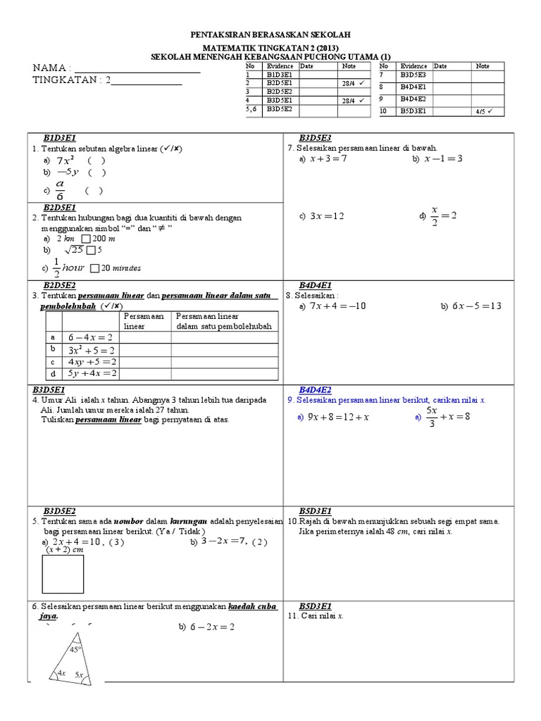 Persamaan linier yang melibatkan nilai mutlak 5. Aug 20, 2016 · bab 2 persamaan dan pertidaksamaan linear 1. May 08, 2018 · sebelum memasukan data tersebut ke persamaan b 1, b 2, dan a kita gunakan metode skor deviasi untuk menyederhanakan data tersebut. Semua video bagi subjek tingkatan 4. Bab 6 hukum linear bab 7 geometri koordinat Bab 3 sistem persamaan dan pertidaksamaan linear 1. Bab 1 fungsi dan persamaan kuadratik dalam satu pemboleh ubah. Menerapkan dan menganalisis konsep barisan dan deret 7. Menemukan konsep sistem persamaan linear dua variabel 2. Pengertian relasi dan fungsi beserta grafiknya 2. 4 1.0 pengaturcaraan 1.1 strategi penyelesaian masalah 1.2 algoritma 1.3 pemboleh ubah, pemalar dan jenis data 1.4 struktur kawalan 1.5 amalan terbaik pengaturcaraan 1.6 struktur data dan modular 1.7 pembangunan aplikasi 5. Menerapkan dan menganalisis konsep garis dan sudut, bangun datar, serta teorema phytagoras b. Matematik tingkatan 1 kssm bab 1 nombor nisbah bab 2 faktor dan gandaan bab 3 kuasa dua, punca kuasa dua, kuasa tiga dan punca kuasa tiga bab 4 nisbah, kadar dan kadaran bab 5 ungkapan algebra bab 6 persamaan linear bab 7 ketaksamaan linear bab 8 garis dan sudut bab 9 poligon asas bab 10 perimeter dan luas bab 11 pengenalan set bab 12.